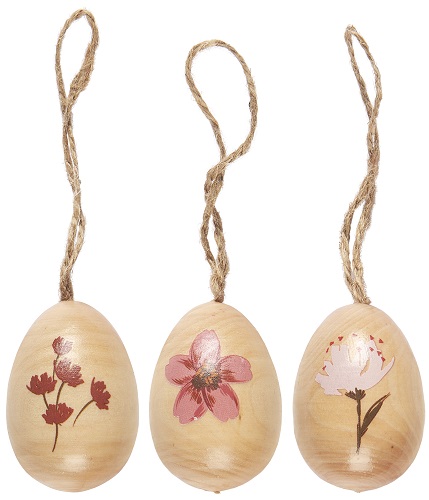 Påskeæg til ophæng lavet i træ og med fint påmalet mønster. Ægget findes med tre forskellige mønstre.