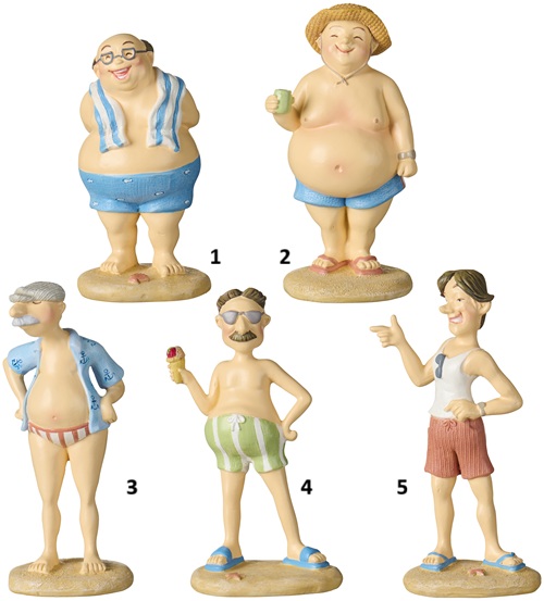 Charmerende og humoristiske Strandkonge figurer i badetøjbringer. Perfekte som en sjov og dekorativ detalje i sommerhuset eller badeværelset.