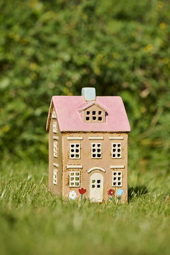Charmerende og dekorativt keramik hus til fyrfadslys fra Ib Laursen . Huset er inspireret af husene i Nyhavn. Dette hus har lyserødt tag og blomster på begge sider af døren.